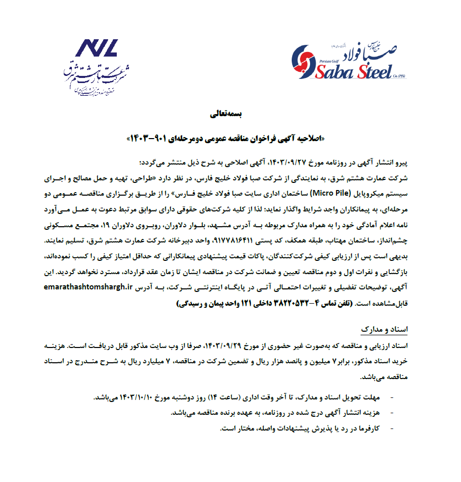 آگهی فراخوان مناقصه عمومی دومرحلهای ۹۰۱-۱۴۰۳